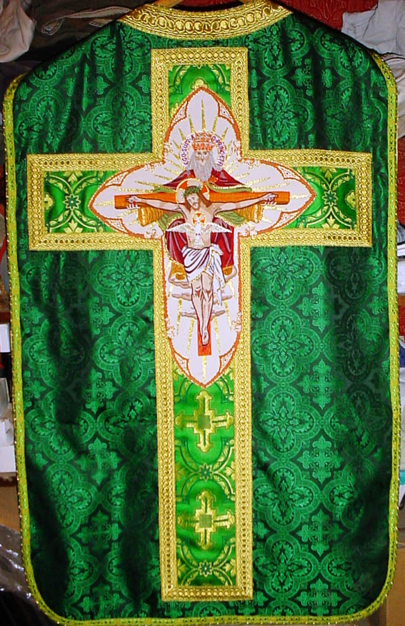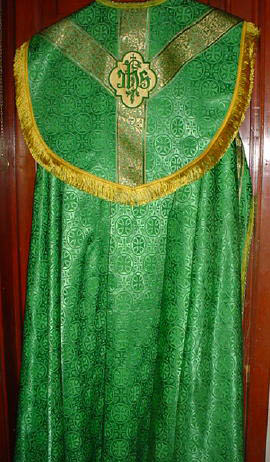 GOLD METALLIC ON WHITE SATIN BROCADE ROMAN SET Gold metallic Brocade makes the green cross on back super fine with imported hand sewn vesica of green velvet. Lined in a pastel green satin. Edged in imported French galoons & piping. |