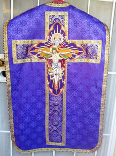 NEW VIOLET HOLY TRINITY ROMAN VESTMENTS All five parts complete set. Lined in gold satin. Hand embroidered Trinity vesica Sent by EMS |