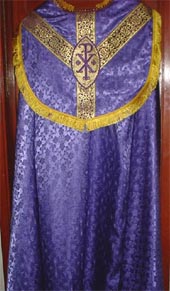 NEW GOOD SHEPHERD VIOLET VESTMENT This is a new design using a HAND EMBROIDERED vesica of the Good Shepherd. It is made with the finest imported brocade and galloons from Europe. It is our standard size which measures 27" wide x 43" long. Fully lined in gold satin. We can make this and other vestments longer or shorter if needed. Comes complete with matching stole, burse, maniple , & chalice veil. Ideal to use durng Lent or Advent. |