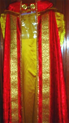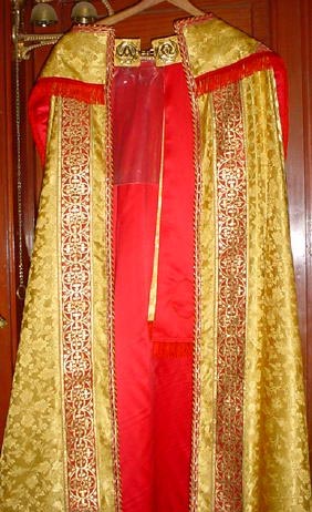 NEW SATIN BROCADE RED COPE Available in ALL colors. fully lined in gold satin. New gold plated broaches. Comes with matching stole. We can make this cope for a tall or short person according to the length you request. Also available matching humeral veil & burse for benediciton at extra cost. |