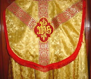 NEW RED ROMAN BROCADE IHS SET Red Brocade Roman set of Liturgical motif. Lined in gold satin. Orphery banding is gold metallic. Available with Holy Ghost, Sacred Heart, Angus Dei, IHS or ChiRho vesica on back. Edged in imported French galoons and piping. |