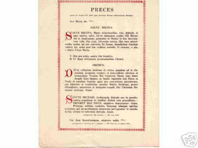 TRADITIONAL TRIDINTINE PRAYERS FOR AFTER MASS. We have reproduced from an original antique set the traditional "prayers after low mass" card in laminated plastic. A must for EVERY church and chapel that offers the Traditional Tridentine Latin Mass!! These prayers were ordered to be said after Low Mass by Pope Leo XIII in all the churches of the world. Indulgences were approved for these prayers by St. Pius X, 17th June 1904. This laminated card measures 10 1/2" x 7 1/4". These prayers are TWO sided. The front side is in ENGLISH, the reverse side is in LATIN: You cant find these anywhere anymore for any price, except at Pax House. |