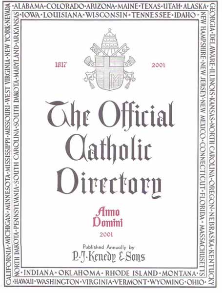 P.J. Kenedy FOR 2001 It is in MINT condition in original box, never opened. Hard bound in brown cloth binding with gilt embossed letters on cover & spine. Is as big as a Manhattan phone directory 11" x 8 1/2" x 2 1/4" thick, with over 1,600 pages; lots of adversising in back and front covers of church related businesses. Also included are a couple of supplements and catalogs from religious goods vendors. The Directory contains names, addresses, phones & faxes for every Cahtolic Church , convent, monastery, school, religious orders & Catholic Institutions and statistics in the USA, ALL names of priests and bishops and tons of useful information. A new copy of this years directory would cost you over $300! |