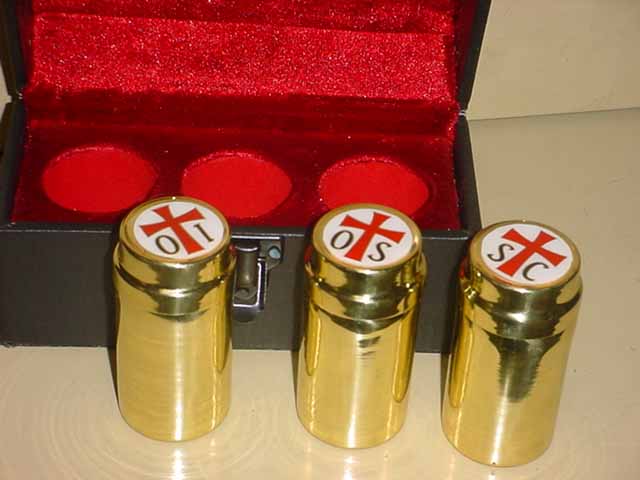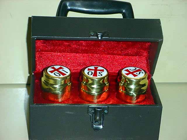 | 239 | LARGE FANCY SCHMANCY OIL STOCKS New with velvet lined wooden carrying case which measures 7 1/2" x 4" tall x 3 1/2" deep. Oil stocks are made of real brass with amber glass bottles inside with acrylic enamel crosses on top. The bottles measure 4" tall , 2" diameter. |