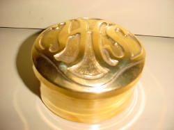 HOST BOX Large priests host box for sacristy. All hand made in brass, gold plated. Has hand cut IHS on lid. It is 2" tall, 3 1/2" diameter. |