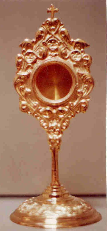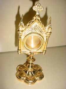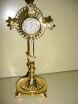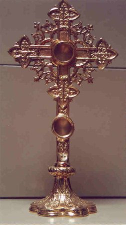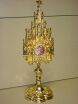 ORNATE RELIQUARY All brass construction with glass lens. Stands 16" tall, opening in back is 1 3/4". Available in polished & lacquered brass, Silver Plate or Gold Plate |