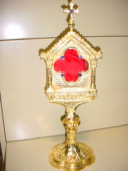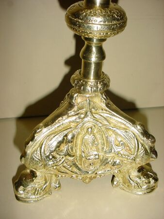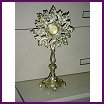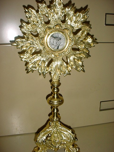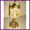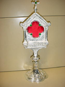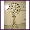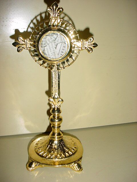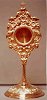 RELIQUARY Back In Stock! All brass reliquary stands 9 1/2" Tall has 2" chamber. Chamber opens to 1 1/2". Available in silver plate, and gold plate. |