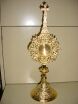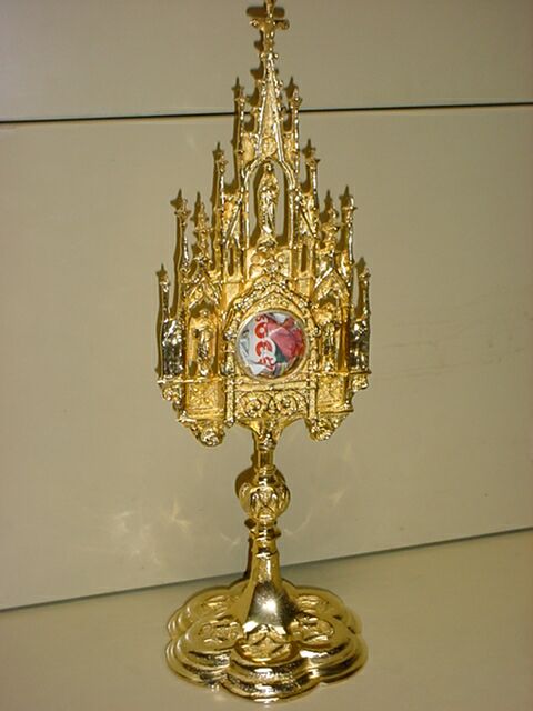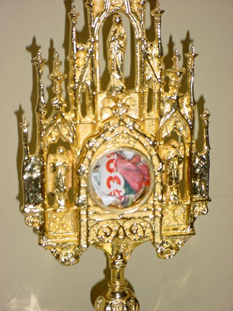 NEW! LARGE ORNATE GOTHIC RELIQUARY Made of solid cast brass gold plate. Stands 15 1/2" tall. Chamber opens 1 1/2" diameter. |