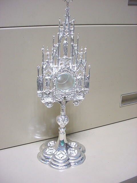 NEW! LARGE ORNATE GOTHIC RELIQUARY Made of solid cast brass silver plate. Stands 15 1/2" tall. Chamber opens 1 1/2" diameter. |